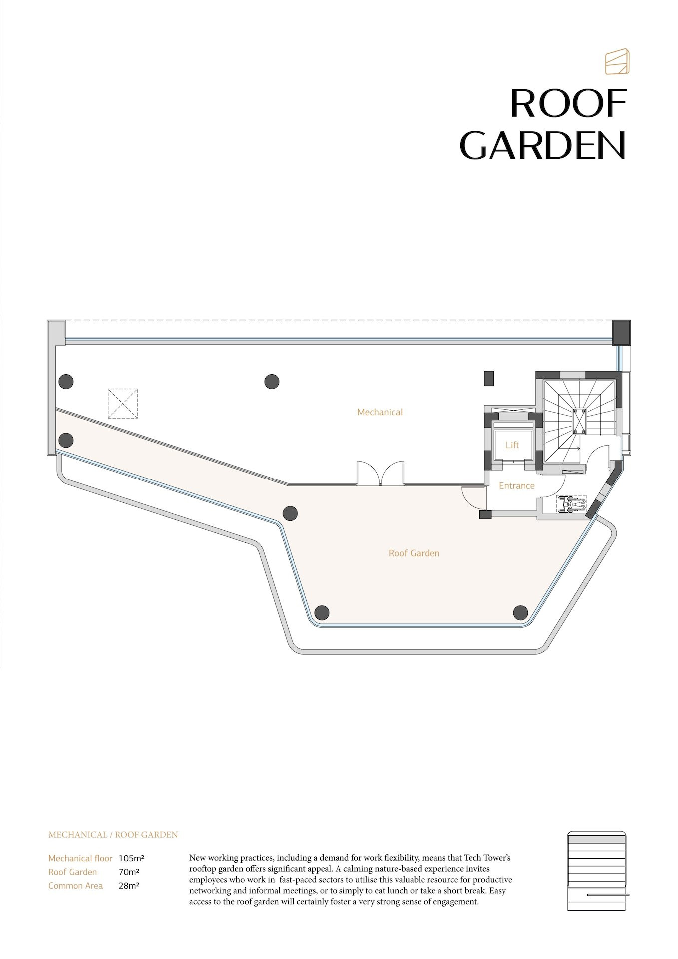 Enhanced with state-of-the-art amenities, including high-speed elevators, a lush roof garden, and photovoltaic panels for energy efficiency, the building ensures a comfortable and sustainable working environment.